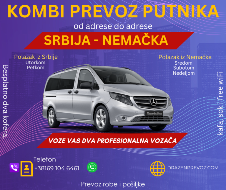 Odabirom najoptimalnije rute putovanja, brzo i komforno stižete na neku od željenih destinacija. Kombi prevoz putnika Nemačka Vam garantuje bezbednu i udobnu vožnju u kombijima novije generacije koji ispunjavaju sve tehničke standarde, kao i standarde u pogledu komfora i higijene.